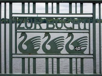 Keywords: railing metal grid bridge blacksmithing booked swans art water