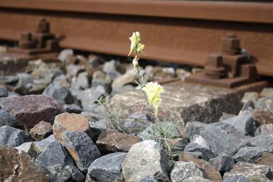 Keywords: railroad track railway embankment flower plant yellow stones iron seemed blossom bloom gravel