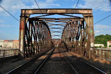 Keywords: railway bridge rust street ties track railroad tracks gravel railway vista prague