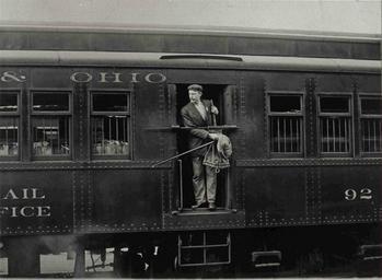 | Keywords: smithsonian institution smithsonianinstitution usps clerk baltimore & ohio baltimoreohio train railway post office railwaypostoffice mail train car traincar bag catcher bagcatcher ohio railway train mail trainmail mail exchan mailexchan man suit national postal museum nationalpostalmuseum clerestory coach - us stock clerestorycoachusstock npcs 100 years old 100yearsold mail across the commons mailacrossthecommons Description: A Railway Post Office clerk is photographed holding a mail pouch and leaning out of a Baltimore &amp; Ohio railroad car next to the car's mail exchange arm, as if waiting to make a mail exchange. Creator/Photographer: Unidentified photographer Medium: Black and white photographic print Culture: American Geography: USA Date: 1913 Collection: U.S. Railway Mail Service Repository: National Postal Museum Accession number: A.2006-64 Persistent URL: arago.si.edu/index.asp?con=2&amp;cmd=1&amp;id=194316 Description: A Railway Post Office clerk is photographed holding a mail pouch and leaning out of a Baltimore & Ohio railroad car next to the car's mail exchange arm, as if waiting to make a mail exchange. Creator/Photographer: Unidentified photographer Medium: Black and white photographic print Culture: American Geography: USA Date: 1913 Collection: U.S. Railway Mail Service Repository: National Postal Museum Accession number: A.2006-64 Persistent URL: arago.si.edu/index.asp?con=2&cmd=1&id=194316 <b>Description</b>: A Railway Post Office clerk is photographed holding a mail pouch and leaning out of a Baltimore & Ohio railroad car next to the car's mail exchange arm, as if waiting to make a mail exchange.