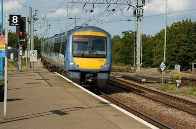 Keywords: railway station arriving train britain transport railroad travel locomotive track platform wagon public technology commuting
