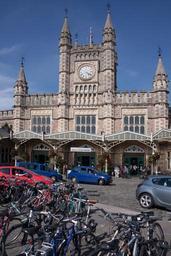 Keywords: railway station taxi bicycles forecourt clock pedestrian travellers travel departure arrival transport architecture building