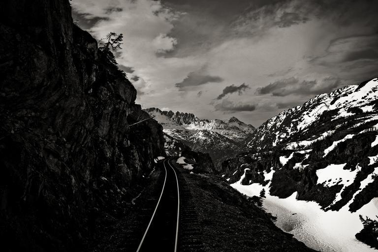 Keywords: railway tracks transport railroad travel perspective steel traffic mountains nature snwo winter cold atmospheric lonely black and white scenic