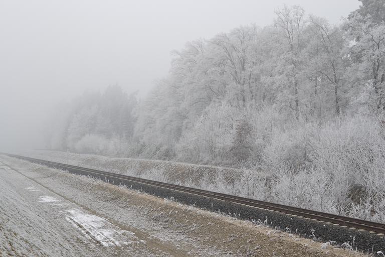 Keywords: railway train railroad track fog hoarfrost autumn cold nature mystical