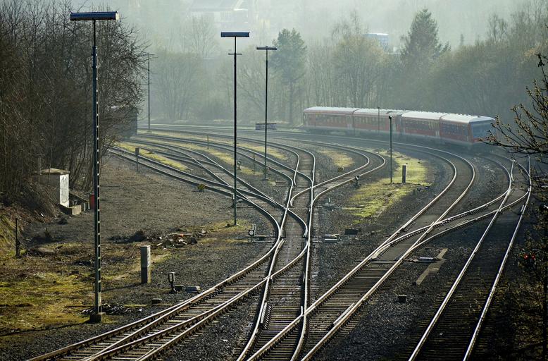 Keywords: railways routes tracks sidings yield curve rail- cars br628 ramifications rail traffic railway railway rails railway tracks train diesel diesel railcar railway station gleise gravel haze abstellanlage