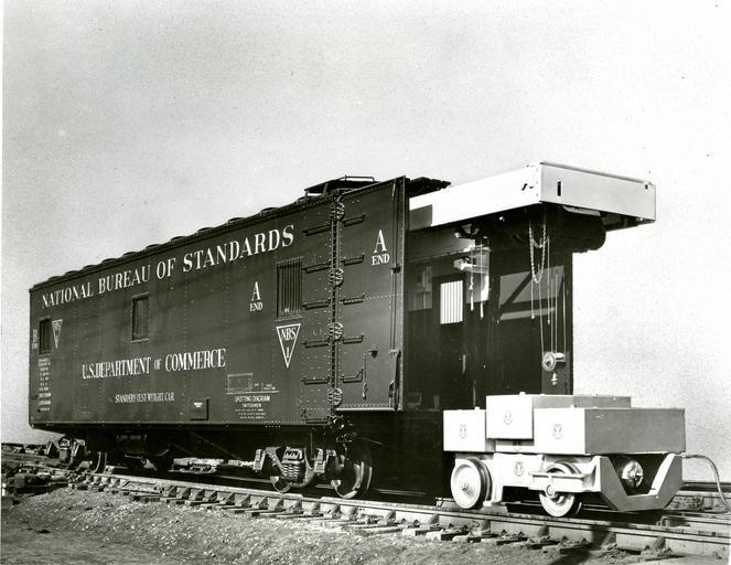 Keywords: RailwayTestCar 004.jpg The test cars were also used to calibrate other industrial railroad scales whenever the NBS schedule permitted A total test load of 80 000 pounds was carried by each car This consisted of 7 ten thousand-pound weights 3 of which were mounted on the small truck right and the truck itself which was adjusted to weigh exactly 10 000 pounds Auxiliary equipment was carried on the car for proper handling of the test weights National Institute of Standards and Technology 3/10/1949 National Institute of Standards and Technology PD-USGov-NIST PD-USGov National Bureau of Standards National Institute of Standards and Technology Rail transport safety Crash tests rail |