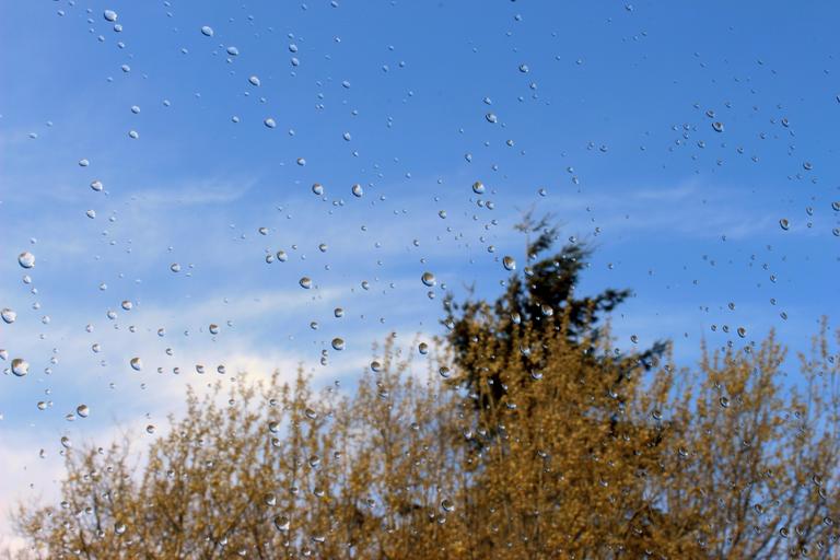 Keywords: rain raindrop window pane nature drip wet beaded trees sky weather