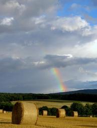 Keywords: rainbow color field harvest agriculture straw bales round bales harvested