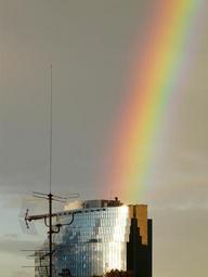 | Keywords: rainbow farbenspiel phenomenon rain sunshine refraction sky nature spectrum colorful natural phenomenon rainbow colors ray natural spectacle of course spectacular clouds half circle home grow out go up sparkle facade architecture antenna technology maritime new ulm luxury hotel glass hotel |