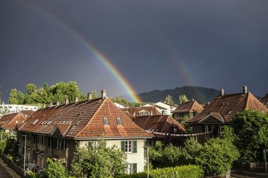Keywords: rainbow home bern clouds colorful rain spectacular city sunshine rainbow colors sky weather half circle roof color switzerland light artfully