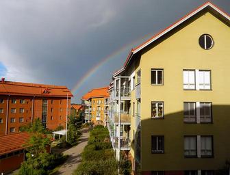 Keywords: rainbow natural phenomenon refraction of light halo houses buildings dark clouds finnish dark clouds
