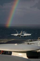 Keywords: rainbow sky clouds sea ocean water jet fighter aircraft takeoff dec ship navy military carrier