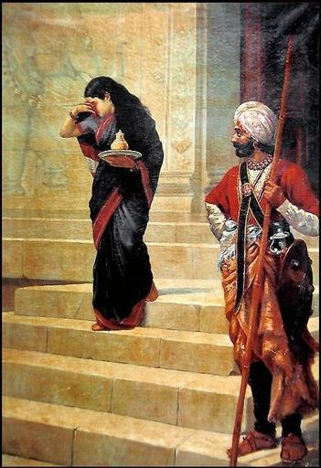 Keywords: Raja Ravi Varma, Sairandhri (1891).jpg Artwork Creator Raja Ravi Varma Sairandhri w Draupadi disguised as Sairandhri going to the court of Keechaka carrying milk and honey സൈരന്ധ്രിയായ വി ദ്രൗപദി പാലും തേനുമായി ക ചകന്റെ സദസ്സിലേയ്ക്ക് പോകുന്നു 1891 Oil on canvas Bombay Arts Society Dept of Archeology and Museum w Mumbai Maharashtra ബോംബെ ആർട്സ് സൊസൈറ്റി വി മുംബൈ മഹാരാഷ്ട്ര object history credit line accession number http //www museumsyndicate com/item php item 25540 <gallery>File Raja_Ravi_Varma _Pleasing jpg </gallery> Malayalam loves Wikimedia event 2011 April PD-Art-100 Depiction of scenes from the Mahabharata by Raja Ravi Varma Draupadi Soldiers of India in art 1891 paintings by Raja Ravi Varma |