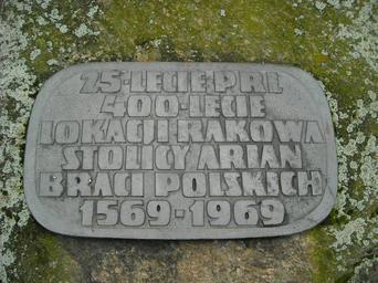 | Keywords: Raków obelisk 2.jpg pl Raków tablica na kamieniu upamiętniającym 400 rocznicę lokacji miasta en Raków Poland A commemorative stone 25 years of the Polish Peoples Republic 400 years of the foundation of Raków - a capital of the Polish Brethren 1569-1969 own Wikipek Raków powiat kielecki |