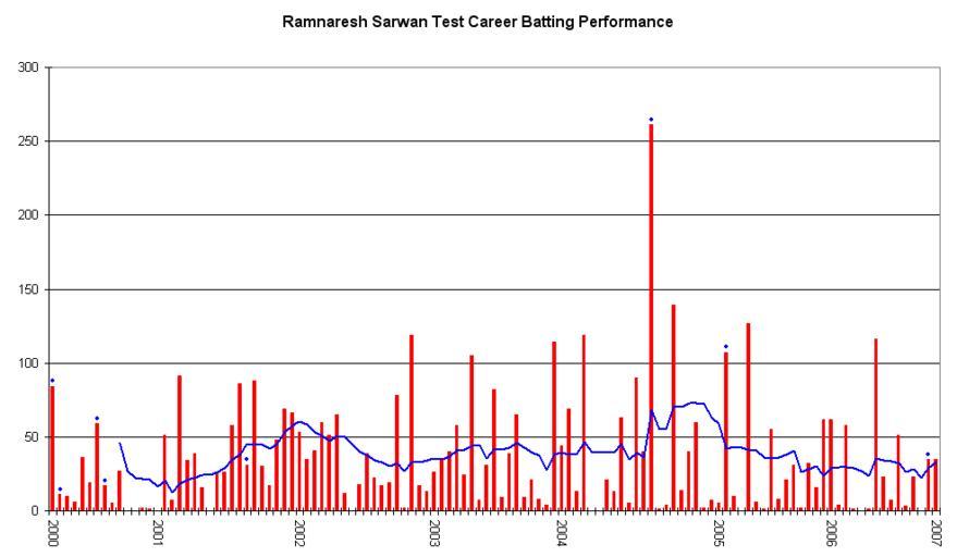 | Keywords: Ramnaresh Sarwan graph.png Test Match performance of Ramnaresh Sarwan It was created by Raven4x4x The red bars indicate the player's test match innings while the blue line shows the average of the ten most recent innings at that point Note that this average cannot be calculated for the first nine innings The blue dots indicate innings in which Sarwan finished not-out This graph was generated with Microsoft Excel 2002 using data from Cricinfo http //stats cricinfo com/statsguru/engine/player/52969 html class 1;orderby start;template results;type batting;view innings and Howstat http //www howstat com au/cricket/Statistics/Players/PlayerProgressBat asp PlayerID 2220 The information in this chart is current as of 28 January 2008 2008-1-28 Own <br />Transferred from http //en wikipedia org en wikipedia Raven4x4x at http //en wikipedia org en wikipedia en wikipedia Raven4x4x original upload log page en wikipedia Ramnaresh_Sarwan_graph png 2008-01-28 00 57 Raven4x4x 986×574 5354 bytes <nowiki>This graph details the Test Match performance of Ramnaresh Sarwan It was created by Raven4x4x The red bars indicate the player's test match innings while the blue line shows the average of the</nowiki> DEFAULTSORT Sarwan Ramnaresh 1980 births Cricket in England West Indies Test cricketers Test cricketers graphs of India |