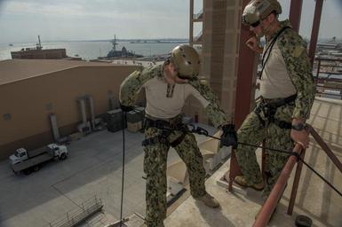 | Keywords: Rappel training 141215-N-BJ254-011.jpg en U S Navy Explosive ordnance disposal technicians assigned to Commander Task Group 56 1 conduct rappelling training CTG 56 1 conducts mine countermeasures explosive ordnance disposal salvage diving and force protection operations throughout the U S 5th Fleet area of responsibility 2014-12-16 CTG https //www dvidshub net/image/1706711 141215-N-BJ254-011 2014-12-20 02 35 MANAMA BH PD-USGov-Military-Navy Manama United States Navy Explosive Ordnance Disposal Images from DoD uploaded by Fæ |