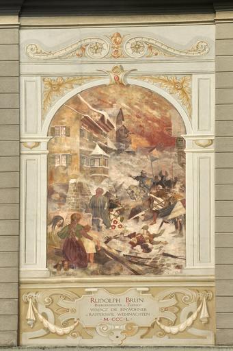 | Keywords: Rapperswil - Curti-Haus - Zerstörung durch Brun 1350 2011-07-27 17-05-56 ShiftN2.jpg Zerstörung von Rapperswil SG Gemälde an der Rückseite des Hauses Curtiplatz 1 in Rapperswil <br>Beschriftung «Rudolph Brun Bürgermeister v Zürich verjagt die Einwohner v Rapperswil Weihnachten 1350» Rudolph Brun City of Zurich mayor banishing the citizens of Rapperswil Christmas 1350 own Wandmalerei von Category Gustav Adolf Closs um 1900 upload Roland zh <gallery perrow 4> File Rapperswil - Altstadt - Hafen IMG 3080 JPG File Rapperswil - Altstadt - Unteres Curti-Haus IMG 3169 jpg File Rapperswil - Altstadt - Unteres Curti-Haus IMG 3171 jpg File Rapperswil - Curti-Haus Wandmalereien OG IMG 0129 JPG File Rapperswil - Altstadt - Curti-Haus IMG 3070 JPG File Rapperswil - Curti-Haus Eid 1456 IMG 0366 ShiftN jpg File Rapperswil-Brun-Zerstörung 1350 JPG </gallery> 47 13 34 997999 N 8 48 49 955999 E alt 412_source exif_heading PD-old Files by User Roland zh Taken with Nikon D90 Murals of Curti-Haus Rapperswil History of Rapperswil Military history of Switzerland Frescos in Switzerland July 2011 in Switzerland 2011 in Rapperswil-Jona Art of Rapperswil Gustav Adolf Closs Rudolf Brun 1350 in Switzerland Military history of Zürich Fires in Switzerland Corrected with ShiftN |