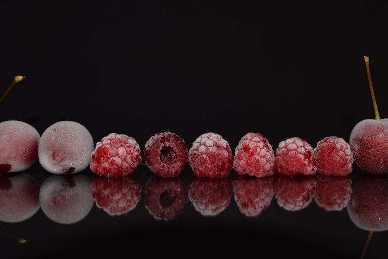 Keywords: raspberries cherries close red fruits mirroring healthy frosted frisch cool delicious gut