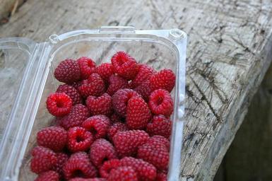 Keywords: raspberries harvest nature red ripe sweet box plastic box berries