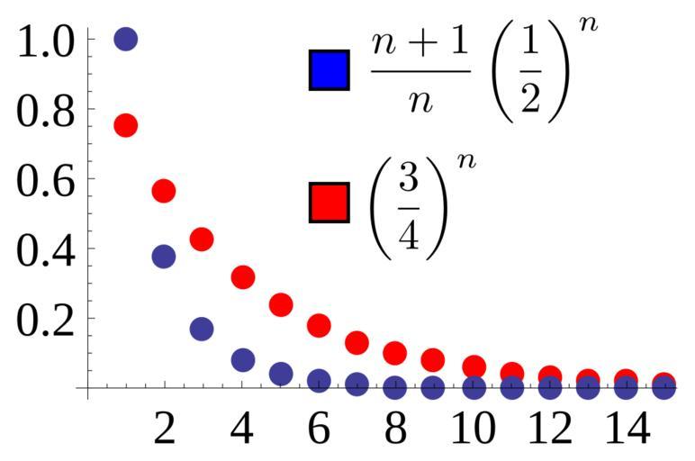 | Keywords: Ratio test proof.svg ratio test test is proven in the convergent case Given a sequence like the blue one for which the ratio of adjacent terms <math> a_ n+1 /a_n </math> converges to L < 1 we identify a ratio r L+1 /2 and show that for large enough n the sequence is dominated by the simple geometric sequence r<sup>k</sup> In this case the ratio of adjacent terms of the blue sequence converges to L 1/2 so we choose r 3/4 and r<sup>k</sup> dominates for all n ‰¥ 2 Source used to generate this chart is shown below own User Dcoetzee 2013-03-24 Cc-zero Source All source released under CC0 waiver Mathematica source to generate graph which was then saved as SVG from Mathematica <pre> Show 3/4 n n 1 15 PlotStyle -> Hue0 PointSizeLarge ListPlot n + 1 /n 1/2 n n 1 15 PlotStyle -> PointSizeLarge PlotRange -> All AxesStyle -> FontSize -> 14 </pre> LaTeX source for labels <pre> \left \frac 3 4 \right n \frac n+1 n \left \frac 1 2 \right n </pre> These were converted to SVG with http //www tlhiv org/ltxpreview/ and then the graph was embedded into the resulting document in Inkscape Axis fonts were also converted to Liberation Serif and the legend was added in Inkscape Sequence mathematics Convergence |