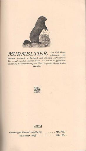 Keywords: Rauchware (Pelze und Preise) 1910 (15).jpg Rauchware Pelze und Preise 1910 Ohne Autorenangabe Vermutlich Katalog anlässlich einer Pelzmodenschau Jede Seite eingeleitet mit der Beschreibung eines Pelztiers dann Modellnamen und Preise unknown / Collection Kuhn 1910 Kürschner PD-old Rauchware Pelze und Preise 1910 Marmot fur advertising Marmota |