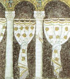 | Keywords: Ravenna, sant'apollinare nuovo dettaglio palatium (inizio del VI secolo).jpg Basilica of Sant'Apollinare Nuovo in Ravenna Italy The Palace of Theodoric Mosaic of a Ravennate italian-byzantine workshop completed within 526 AD by the so-called Master of Sant'Apollinare After the defeat of Theodoric the wall mosaics in the Palace and Cathedral were redone by the Byzantines to remove Gothic features The figures in this mosaic were replaced by curtains detail magnified in this image presumably due to lack of time Several remnants of the earlier work are visible such as a portion of an arm on the third pillar from the left Basilica di Sant'Apollinare Nuovo a Ravenna Il palazzo di Teodorico Mosaico di scuola ravennate italo-bizantina completato entro il 526 d C dal cosiddetto maestro di Sant'Apollinare Dopo la sconfitta del re goto Teodorico i mosaici murali del suo palazzo e questi della cattedrale furono rifatti dai bizantini per cancellare ogni traccia dei precedenti dominatori I dignitari Goti di questo mosaico furono frettolosamente rimpiazzati da tende ritratte in dettaglio in questa immagine probabilmente per mancanza di tempo Rimangono diverse tracce del mosaico precedente per esempio un pezzo di un braccio sulla terza colonna da sinistra PD-old Palace of Theodoric in the mosaics at Sant'Apollinare Nuovo Ravenna |