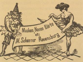 | Keywords: Ravensburg Fastnacht 1890 Masken Nasen Bärte.jpg Ravensburg Anzeige im Oberschwäbischen Anzeiger 19 Jh Masken Nasen Bärte etc M Scherrer Ravensburg Beate Falk Chronik der Ravensburger Fasnacht 1353 “1968 in Albert Schmid Hrsg Fasnacht in Ravensburg Ein Streifzug von 1353 bis heute Oberschwäbische Verlags-Anstalt Ravensburg 2000 ISBN 3-926891-25-4 S 89 wohl 1890 Bildnachweis ist nicht ganz eindeutig interpretierbar 1890 author PD-old-70-1923 History of carnival in Ravensburg | ||||