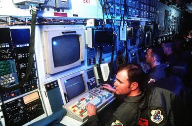 | Keywords: RC-135W Rivet Joint interior.jpg Caption An Air Combat COMMAND 55th Wing RC-135W Rivet Joint reconnaissance aircraft from Offutt Air Force Base Nebraska flies a training mission over Nebraska The RC-135W works closely with the E-3A Airborne Warning And CONTROL SYSTEM AWACS during war or contingency situations providing direct near real-time reconnaissance INFORMATION and electronic warfare support to theater COMMANDers and combat forces All RC-135s are equipped with an aerial refueling SYSTEM which gives the aircraft unlimited range Working in the back end of the RC-135 Air Intelligence Agency airmen deploy a lot This image was used in the May 2000 Airman Magazine and included in the article Rivet Joint Recon Ready Source http //www dodmedia osd mil ID DFSD0200977 200-05-01 Camera Operator MSGT DAVE NOLAN USAF PD-USGov RC-135V/W Rivet Joint Multi-monitor Men at work |