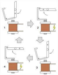 | Keywords: RCEscapement.png Radio control escapement Used in model airplane and watercraft control ca 1950 - 1965<br> A spring is used to return the stop to the neutral position when<br> the electromagnet coil is not energized<br><br> Operation sequence reads clockwise from upper left 1 Escapement at rest neutral<br><br> 2 Escapement coil energized left for example <br><br> 3 Escapement at rest second neutral<br><br> 4 Escapement coil energized right for this example <br><br> Variations Compound escapement By putting a sight offset e g toward the viewer in one arm of the rotating blade and cutting back on the rest inactive coil stop the device would have only one neutral stop One directional stop is then always selected on the first pulse and hold To select the other direction from this single neutral a pulse with brief hold release and then hold is commanded Four arm escapement A four-arm version arranged as a <big> + </big> does not have the neutral catch remote from the magnet but rather a single catch location with catch points operating on alternate arm pairs depending upon the magnet state cutting back an appropriate arm will create the compound action described above Additional functions More complex systems have used additional pulse sequences to offer elevator kick up so that a loop may be performed after a spiral dive or up and down elevator control Such multi-stop systems also have employed electrical contacts to drive a second escapement to control a motor throttle Diagram of motion of a radio control model escapement own 2008-01-28 Leonard G Public Domain Servos radio control |
