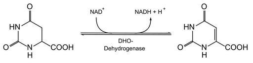 | Keywords: Reaction of DHO to orotate.svg step 4 of pyrimidine de novo synthesis; oxidation of dehydroorotate to orotate by dehydroorotate dehydrogenase 4 Schritt der Pyrimidin-De-Novo-Synthese; Oxidation von Dehydroorotat zu Orotat durch Dehydroorotat-Dehydrogenase own 2008-06-16 --Ilgom talk Chemical reactions Orotic acid |