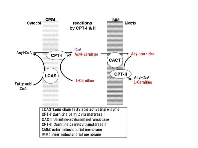 Keywords: Reactions through mitochondrial membrane.png en mechanism of fatty acids and L-carnitine going through mitochondrial membrane own Matsan5 2010-06-07 Carnitine Dietary supplements