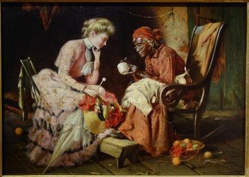 | Keywords: Reading Tea Leaves by Harry Herman Roseland, 1906, oil on canvas - New Britain Museum of American Art - DSC09351.JPG en Exhibit in the New Britain Museum of American Art New Britain Connecticut USA This artwork is in the public domain because the artist died more than 70 years ago The museum permitted photographs of this exhibit without restriction 2013-06-27 12 32 17 own Daderot PD-old-70-1923 cc-zero Paintings in the New Britain Museum of American Art Uploaded with UploadWizard Harry Roseland |