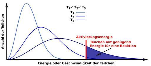 | Keywords: Reaktionsgeschwindigkeit-Temperatur2.svg de Abhängigkeit der Reaktionsgeschwindigkeit von der Temperatur 2014-07-13 13 31 48 v reset set terminal svg size 1600 700 enhanced font 'sans-serif bold 27' lw 5 set output 'maxboltz svg' set key top center title 'T_1 < T_2 < T_3' set border 3 set xrange 0 7 set samples 1000 unset tics set xlabel 'Energie oder Geschwindigkeit der Teilchen' set ylabel 'Anzahl der Teilchen' f x T x 2 exp - x 2 / T / T 3 /2 Xa 4 T1 1 T2 3 T3 7 set arrow from graph 75 2 to graph 65 075 front set arrow from Xa 0 to Xa f Xa T3 + 04 nohead front lc rgb 'red' lw 2 set arrow to 0 graph 1 front set arrow to graph 1 01 0 front set label 'Aktivierungsenergie' at Xa- 5 f Xa T3 + 06 textcolor rgb 'red' set label sprintf Teilchen mit genügend\nEnergie für eine Reaktion at graph 6 31 textcolor rgb 'red' set style fill solid 75 noborder plot f x T1 title 'T_1' lc rgb 'royalblue' \ f x T2 title 'T_2' lc rgb 'blue' \ f x T3 title 'T_3' lc rgb 'dark-blue' \ Xa<x x < 7 f x T3 1/0 w filledcurves x1 notitle lc rgb 'dark-blue' unset output own StefanPohl cc-zero Grafikwerkstatt Uploaded with UploadWizard Chemical kinetics |