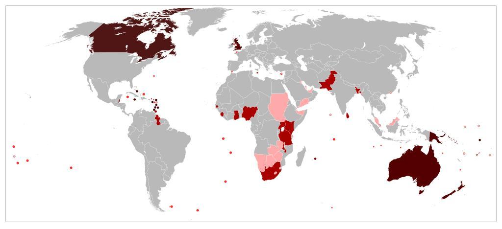 Keywords: Realms territories and protectorates of Elizabeth II.svg en The realms territories and protectorates over which Elizabeth II reigned from 1952 <br />Deep brown Current realms as of 2011 <br />Strong red Former realms became republics between 1956 and 1992 <br />Light red British Overseas Territories Crown dependencies Sovereign Base Areas Australian external territories and the territories and associated states of New Zealand as of 2011 <br />Pink Former territories dependencies and protectorates most recent lost in 1997 <br />Antarctic claims in abeyance since 1961 are not shown Self-made; base map derived from File Commonwealth realms 1992 svg User DrKiernan 2011-03-31 Cc-zero Commonwealth of Nations Elizabeth II of the United Kingdom |