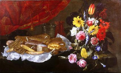 | Keywords: Recco, Giuseppe - A Still Life of Roses, Carnations, Tulips and other Flowers in a glass Vase, with Pastries and Sweetmeats on a pewter Platter and earthenware Pots - 17th c.jpg Artwork creator Giuseppe Recco title A Still Life of Roses Carnations Tulips and other Flowers in a glass Vase with Pastries and Sweetmeats on a pewter Platter and earthenware Pots on a stone Ledge in front of a red Curtain century 17 oil canvas cm 77 8 130 9 Private Aristocratic Collection http //www rafaelvalls co uk/master/painting_detail asp painting_id 215 http //www rafaelvalls co uk/master/images/gallery/Recco-cakesflowers1 jpg Other versions PD-old-100 Still life paintings by Giuseppe Recco 17th-century paintings in unidentified private collections 17th-century paintings not categorised by year 17th-century oil on canvas paintings in Spain 17th-century still life paintings in Spain 17th-century still life paintings of flowers 17th-century still life paintings of food Cakes in art Oil still life paintings Pastries in art Pewter Red textiles in art Tassels in art Uploads by Mattes from external sources Sweetmeats |