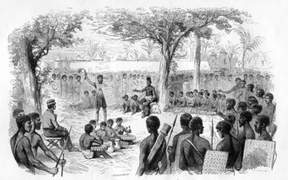 | Keywords: Reception of the Mission by Shinté.jpg en Reception of the Mission by Shinté 17th Tuesday ”We were honoured with a grand reception by Shinte about eleven o ™clock The kotla or place of audience was about a hundred yards square and two graceful specimens of a species of banian stood near one end; under one of these sat Shinte on a sort of throne covered with a leopard ™s skin One of the trees being unoccupied I retreated to it for the sake of the shade We were now about forty yards from the chief and could see the whole ceremony The different sections of the tribe came forward in the same way that we did the head man of each making obeisance with ashes which he carried with him for the purpose; then came the soldiers all armed to the teeth running and shouting towards us with their swords drawn and their faces screwed up so as to appear as savage as possible for the purpose When all had come and were seated then began the curious capering usually seen in pichos A man starts up and imitates the most approved attitudes observed in actual fight This over Sambanza and the spokesman of Nyamoana stalked backwards and forwards in front of Shinte and gave forth in a loud voice all they had been able to learn either from myself or other people the wish to open the country to trade; the Bible as a word from heaven; the white man ™s desire for the tribes to live in peace Behind Shinte sat about a hundred women clothed in their best which happened to be a profusion of red baize A party of musicians consisting of three drummers and four performers on the piano marimba went round the kotla several times regaling us with their music The drums are neatly carved from the trunk of a tree When nine speakers had concluded their orations Shinte stood up and so did all the people He had maintained true African dignity all the while but my people remarked that he scarcely ever took his eyes off me for a moment pp 291-94 1857 http //libweb5 princeton edu/visual_materials/maps/websites/africa/livingstone/livingstone-images html David Livingstone Missionary Travels and Researches in South Africa Including a Sketch of Sixteen Years ™ Residence in the Interior of Africa and a Journey from the Cape of Good Hope to Loanda on the West Coast Thence Across the Continent Down the River Zambesi to the Eastern Ocean London John Murray 1857 David Livingstone other versions PD-Art Uploaded with UploadWizard Christian mission in art David Livingstone |