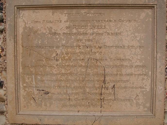 | Keywords: Reculver towers plaque DSCN3803.TIF en Plaque on the ruined towers at Reculver Reads these Towers The remains of the once venerable church of Reculvers were purchased of the parish by the Corporation of Trinity House of Deptford Strond in the year 1810 and groins laid down at their expence to protect the cliff on which the church stood When the ancient spires were afterwards blown down the present substitutes were erected to render the towers still sufficiently conspicuous to be useful to navigation Captn Joseph Cotton Deputy Master in the year 1819 own Jamesjhawkins 2011-09-03 Cc-zero Reculver Church Ruins in Kent Plaques in Kent |