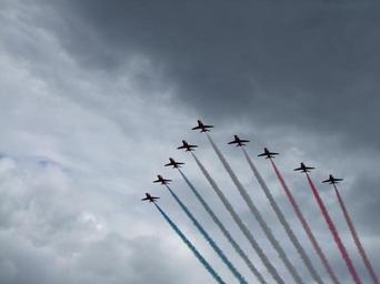 Keywords: Red Arrow squad.JPG Farnborough Airshow 2010 own Jaguar 2010-06-25 Aircraft formation flight of the Red Arrows BAE Hawk in the 2010s