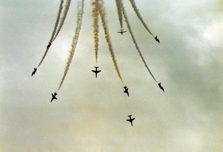 | Keywords: Red Arrows2 Ramstein 1984.jpg The Royal Air Force Red Arrows aerobatics team flying the Hawker Siddley Hawk T 1 at an airshow at Ramstein Air Base Rhineland-Palatinate Germany on 24 June 1984 own 1984-06-24 Cobatfor Aircraft formation flight of the Red Arrows BAE Hawk in the 1980s 24 June June 1984 in West Germany 1984 in aviation Aircraft at Ramstein Air Base |