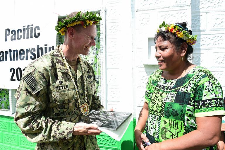 Keywords: Red Beach Primary ribbon cutting 150617-N-HY254-067.jpg en TARAWA Kiribati June 17 2015 Commodore Task Force Forager Capt James Meyer presents a plaque to the principal of Red Beach Primary School Mary Noere during a ribbon cutting ceremony June 17 The ribbon cutting marks the completion of renovations by Seabees attached to Pacific Partnership 2015 Task Force Forager is embarked aboard the Military Sealift Command joint high speed vessel USNS Millinocket JHSV 3 Millinocket is serving as the secondary platform for Pacific Partnership led by an expeditionary command element from the Navy s 30th Naval Construction Regiment 30 NCR from Port Hueneme Calif Now in its 10th iteration Pacific Partnership is the largest annual multilateral humanitarian assistance and disaster relief preparedness mission conducted in the Indo-Asia Pacific region While training for crisis conditions Pacific Partnership missions have provided medical care to approximately 270 000 patients and veterinary service to more than 38 000 animals Additionally Pacific Partnership has provided critical infrastructure development to host nations through the completion of more than 180 engineering products U S Navy photo by Chief Mass Communication Specialist Jonathan Kulp/Released 2015-06-17 Chief Petty Officer Jonathan Kulp https //www dvidshub net/image/2007133 150617-N-HY254-067 2015-06-17 06 07 TARAWA KI PD-USGov-Military-Navy Pacific Partnership 2015 Images from DoD uploaded by FĂŚ |