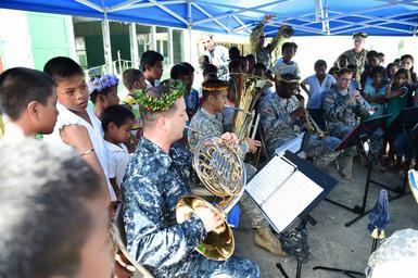 | Keywords: Red Beach Primary ribbon cutting ceremony 150617-N-HY254-075.jpg en TARAWA Kiribati June 17 2015 The Pacific Partnership Joint Band performs during a ribbon cutting ceremony June 17 The ribbon cutting marks the completion of renovations by Seabees attached to Pacific Partnership 2015 Task Force Forager is embarked aboard the Military Sealift Command joint high speed vessel USNS Millinocket JHSV 3 Millinocket is serving as the secondary platform for Pacific Partnership led by an expeditionary command element from the Navy s 30th Naval Construction Regiment 30 NCR from Port Hueneme Calif Now in its 10th iteration Pacific Partnership is the largest annual multilateral humanitarian assistance and disaster relief preparedness mission conducted in the Indo-Asia Pacific region While training for crisis conditions Pacific Partnership missions have provided medical care to approximately 270 000 patients and veterinary service to more than 38 000 animals Additionally Pacific Partnership has provided critical infrastructure development to host nations through the completion of more than 180 engineering products U S Navy photo by Chief Mass Communication Specialist Jonathan Kulp/Released 2015-06-17 Chief Petty Officer Jonathan Kulp https //www dvidshub net/image/2007137 150617-N-HY254-075 2015-06-17 06 07 TARAWA KI PD-USGov-Military-Navy Pacific Partnership 2015 Images from DoD uploaded by FĂŚ |