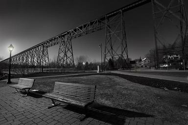 Keywords: red cape bench park floor lamp rest tranquility railway bridge train bridge québec quebec canada landscape