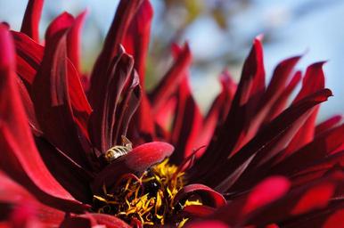 Keywords: red flower bee insect blossom bloom garden poland summer