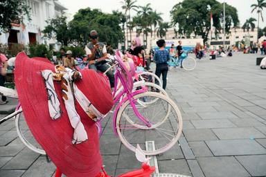 Keywords: red hat hat square bicycle wheel lady summer