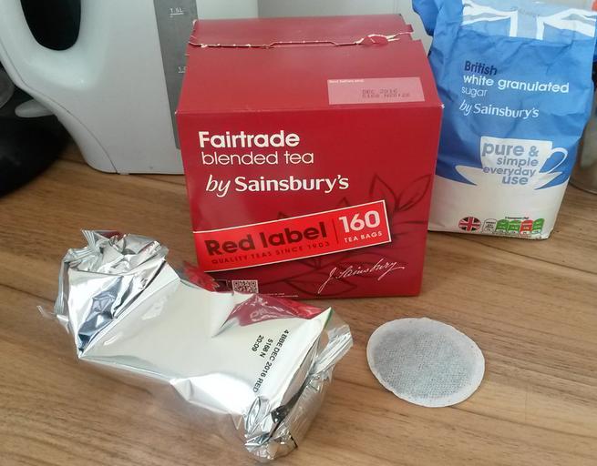 Keywords: Red-label-tea.jpg en Box of Sainsbury's Red Label tea with foil pack and single tea bag in the foreground Kettle and bag of sugar in the background 2015-09-04 11 32 00 own Andrew Oakley other versions Photo taken in England cc-zero Uploaded with UploadWizard Tea |