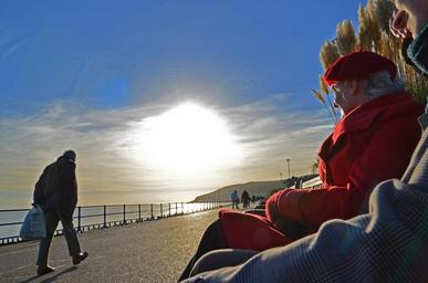 Keywords: red people sunset walking seafront winter blue sky promenade english sea blue nikon d5100 camera