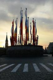Keywords: red square paving grey pedestrian lines white contrast plaza historic late afternoon victory day flags colorful