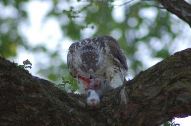 Keywords: Red-tail having dinner.JPG en Red-tailed hawk eating squirrel for dinner in a large tree at the local schoolyard in Pittsburgh PA own MTCoughlin 2010-04-19 Buteo jamaicensis eating Dead squirrels Birds in trees