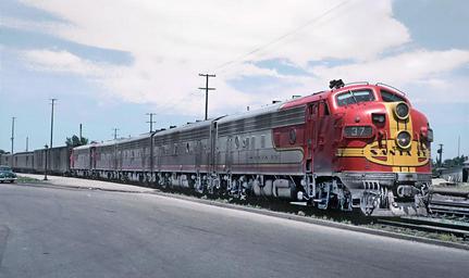 | Keywords: warbonnet santa fe santafe railroad outdoor vehicle train locomotive road These are Roger Puta's photographs. ATSF 37L (F7A) with Train 23, The Grand Canyon, at Streator, IL in July 1963. Note, the "L" is above the buffer. These are Roger Puta's photographs. ATSF 37L (F7A) with Train 23, The Grand Canyon, at Streator, IL in July 1963. Note, the "L" is above the buffer. | ||||