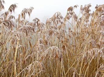 Keywords: reed pond winter wintry ice icy frost frosted nature fog foggy hoarfrost frozen cold plants vegetation seasons